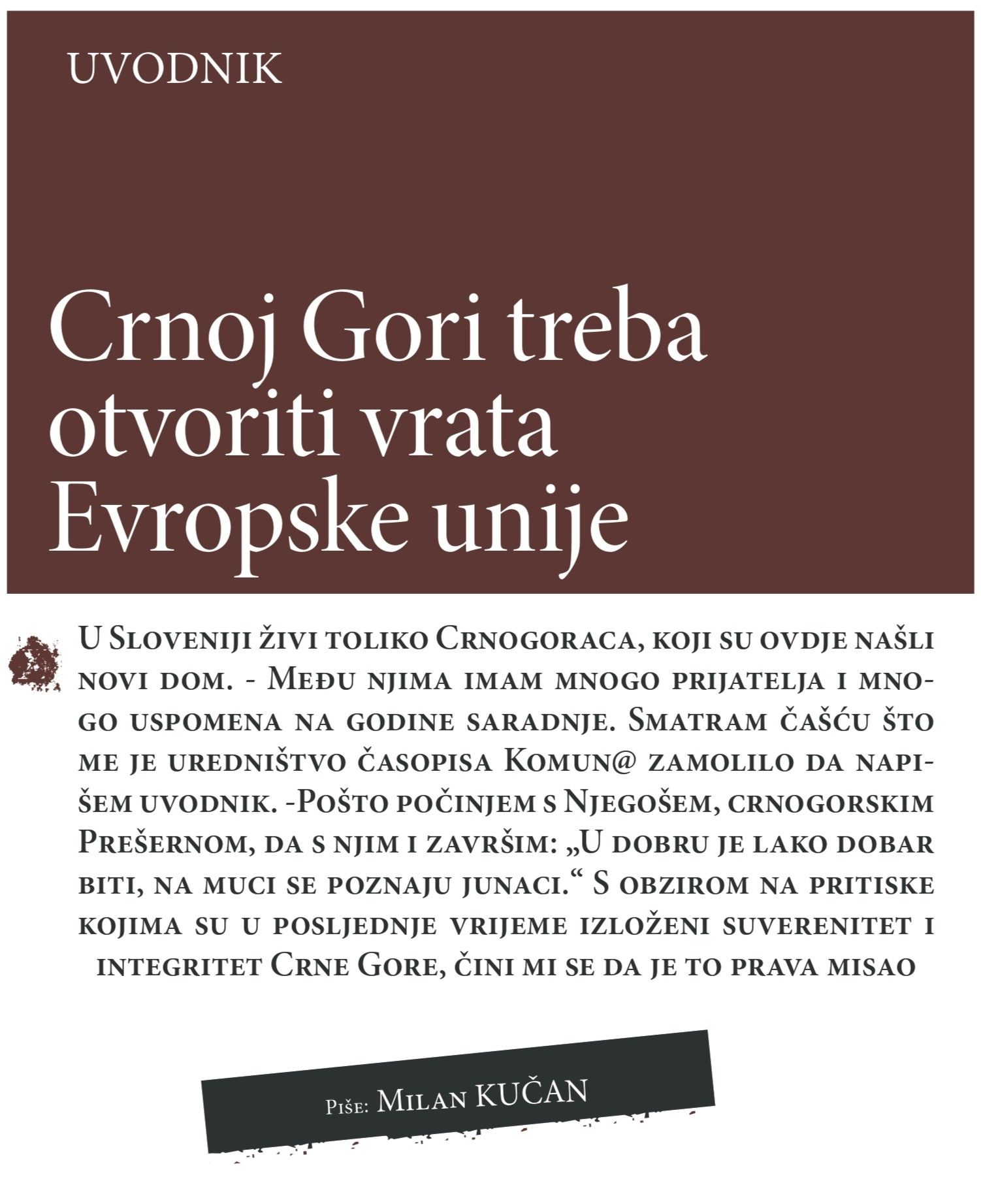 Vjerovatno o tome ni Slovenci ni Crnogorci ne znaju mnogo. A ni to, da u Sloveniji živi toliko Crnogoraca, koji su ovdje našli novi dom, u kojem čuvaju svoju kulturu i identitet i zajedno s nama promišljaju budućnost naše zajedničke domovine. Siguran sam da će manifestacija „Dani Crne Gore u Sloveniji“ doprinijeti otkrivanju života ljudi koji su odlučili da se nakon Durmitora i Lovćena nasele na sunčanoj strani Alpa. Među Crnogorcima imam mnogo prijatelja i mnogo uspomena na godine saradnje. Smatram čašću što me je uredništvo časopisa Komun@ zamolilo da napišem uvodnik.