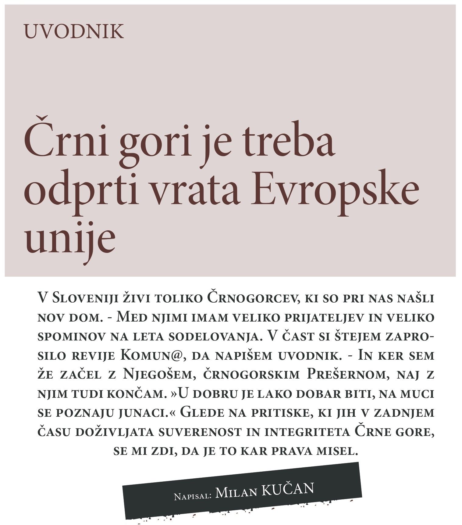 Najbrž o tem ne Slovenci ne Črnogorci ne vedo veliko. Pa tudi tega ne, da v Sloveniji živi toliko Črnogorcev, ki so pri nas našli nov dom, v katerem ohranjajo svojo kulturo in identiteto in skupaj z nami razmišljajo o prihodnosti naše skupne domovine. Zagotovo bo prireditev »Dnevi Črne gore v Sloveniji« prispevala k odkrivanju življenja ljudi, ki so se odločili, da se izza Durmitora in Lovčena naselijo na sončni strani Alp. Med Črnogorci imam veliko prijateljev in veliko spominov na leta sodelovanja. V čast si štejem zaprosilo revije Komun@, da napišem uvodnik.