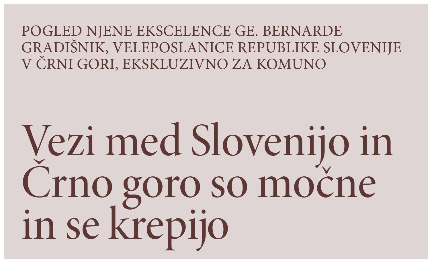 Preden karkoli napišem, moram kot ambasadorka Republike Slovenije v Črni gori poudariti, da so meddržavni odnosi med Slovenijo in Črno goro odlični. Kot dobri sosedje smo si, še boljši pravzaprav, med neposrednimi sosedi se vedno najdejo kakšna mejna vprašanja in zgodovinske zamere, med nami pa tega ni.